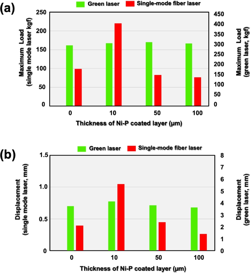 증가함에 따라 최대 하중 (그림 12(a)) 및 변위(그림 12(b))의 변화가 증가 후 감소의 경향을 보이지만, 그린레이저 용접을 적용할 경우, 최대 하중과 변위가 모두 일정하게 유지되는 상반된 결과를 보인다. 이는