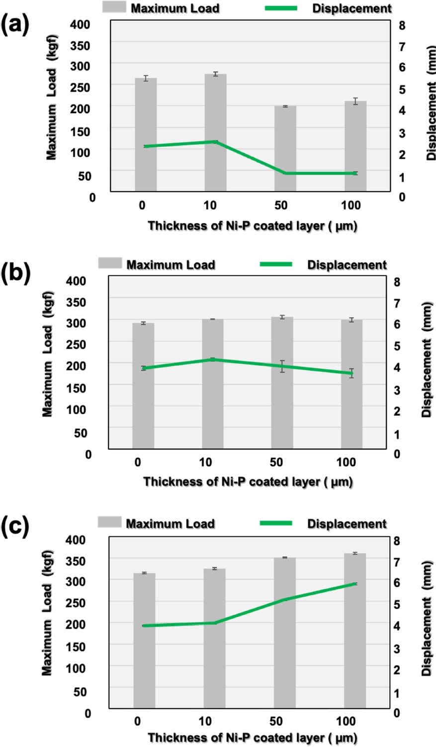 최대 하중을 보인 후 도금 두께 증가에 따라 그 값이 감소하여 Ni-P 100 μm 도금 Cu에서는 210 kgf의 최대 하중을 보였다. 최대 변위