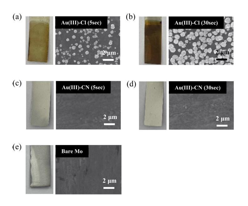 두 금 스트라이크 용액에서 몰리브덴을 5초와 30초 간 침지한 뒤 FE-SEM으로 관찰한 결과, 염화욕 스트라이크 도금액에서는 5초의 짧은 침지 시간에도