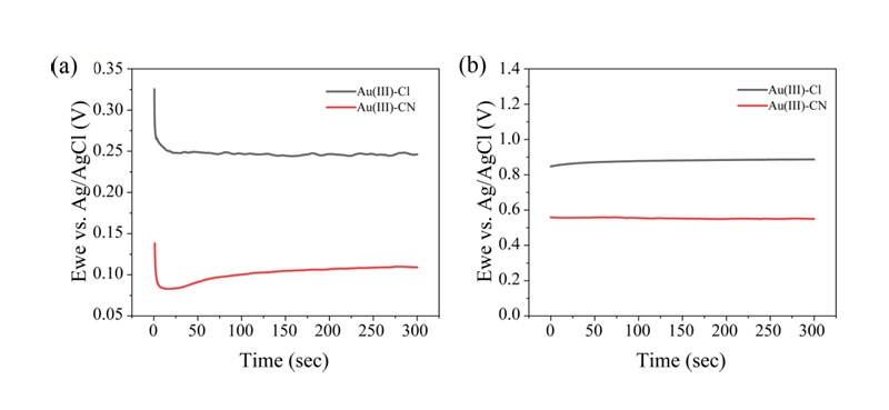 직후 급격한 음전위 방향의 이동을 보였으며, 이후 염화욕에서는 약 +0.25 V 부근에서 빠르게 안정화되었고, 시안욕에서는 약 150초에 걸쳐 점진적으로