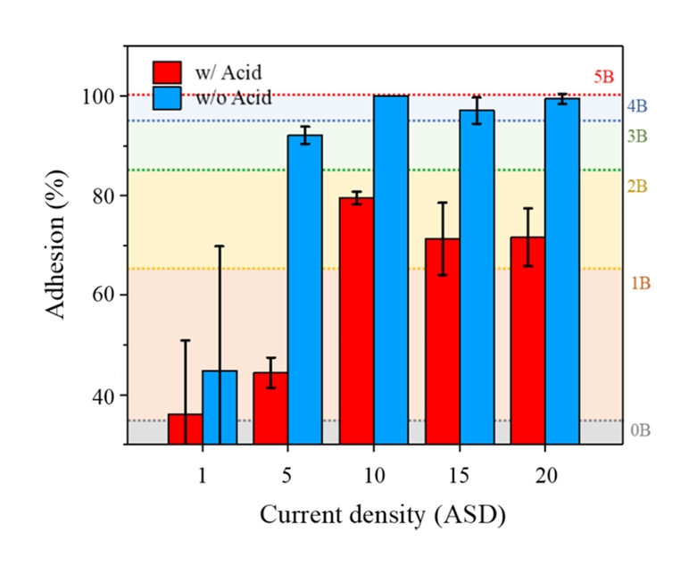 영향은 상당하였다. 실제로 산 활성화 처리 후에는 전반적으로 개선된 밀착력 결과를 보였으며, 10 ASD의 경우 완전한 5B 등급의 밀착력도 확보할