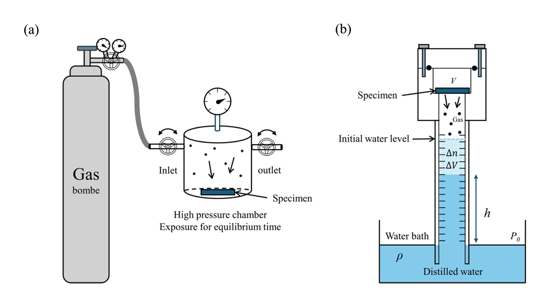 were exposed to the testing gas (H2 or He or N2) in a pressure range from 1 to 10 MPa for 36 hours to ensure complete gas saturation