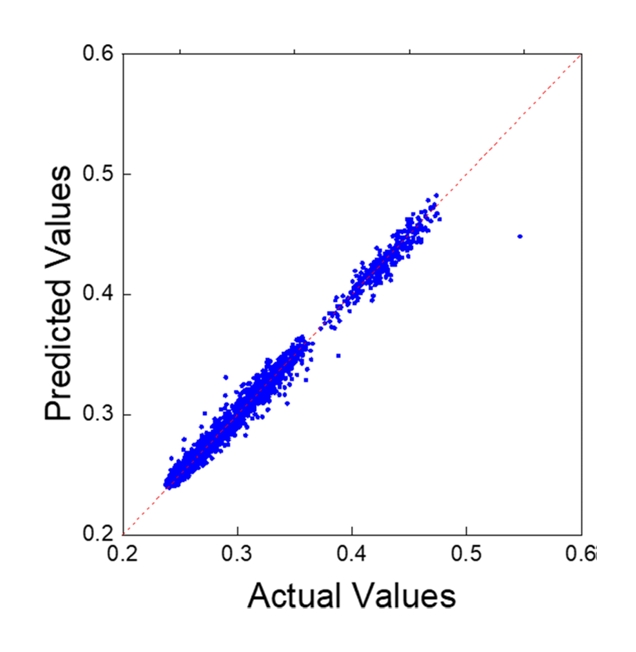 해석된다. 특히, 예측값과 실험값 간의 분포가 주요 밀집 영역에서 잘 정렬되어 있어, 복잡한 물리적 특성이 포함된 조건에서도 전반적으로 일관된 예측