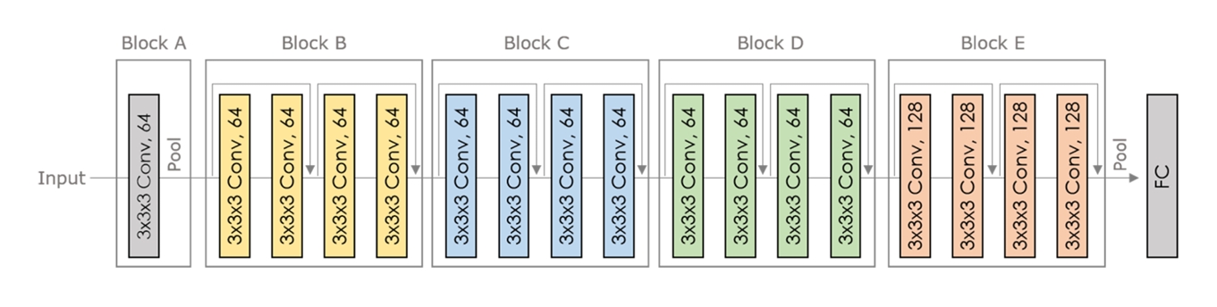 구체적으로, 각 잔차 블록(Residual Block)은 두 개의 3D 합성곱 층과 하나의 잔차 연결로 구성되어, 네트워크가 깊어지더라도 기울기 소실을