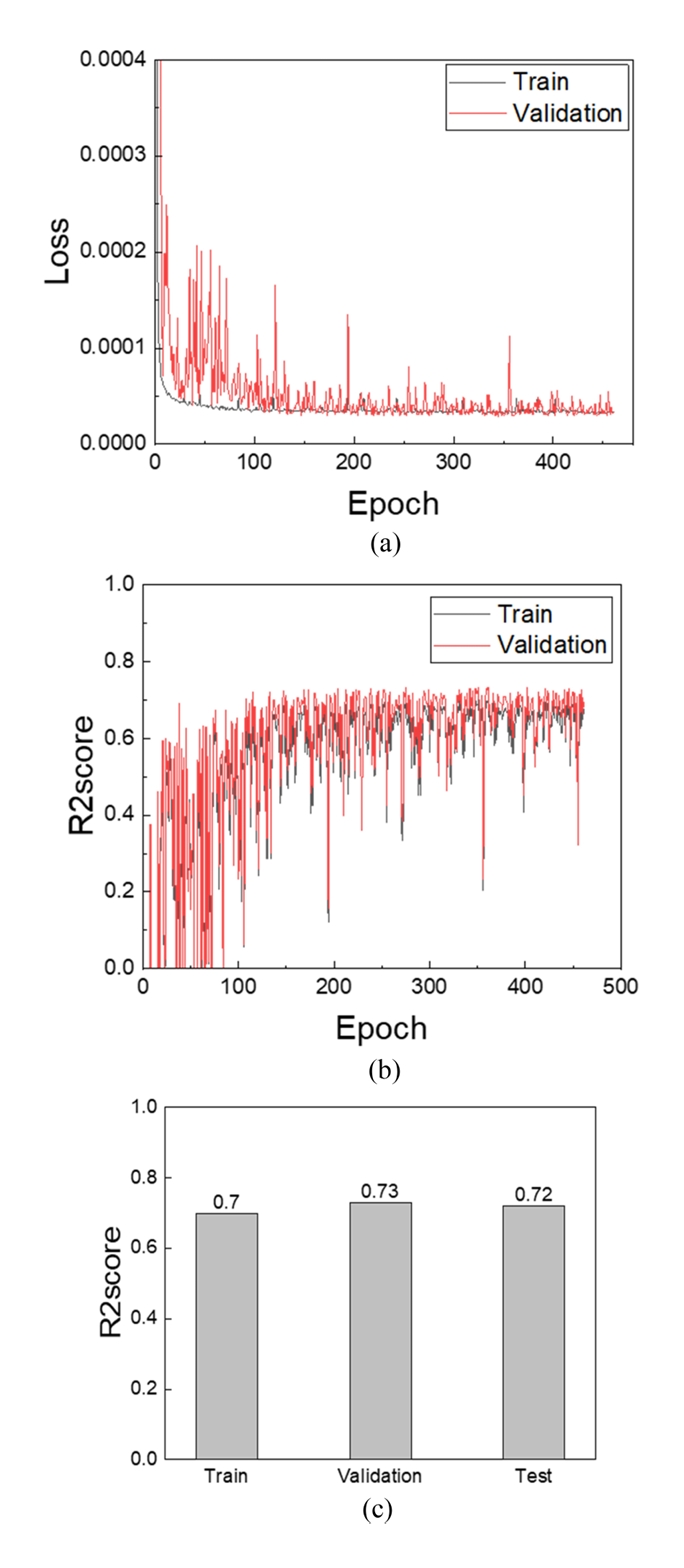 있음을 의미한다. 모델의 성능 평가를 위해서 R2 스코어를 학습 과정에서 함께 계산하였으며, R2 스코어 역시 학습이 진행됨에 따라 꾸준히 증가하는 추이를 확인할 수 있다. 각 데이터 세트에서 R2 스코어는 0.7 내외의 정확도를 보여주고 있으며, 예측을 수행하는 데 준수한 설명력을 가지고 있음을 알 수 있다.