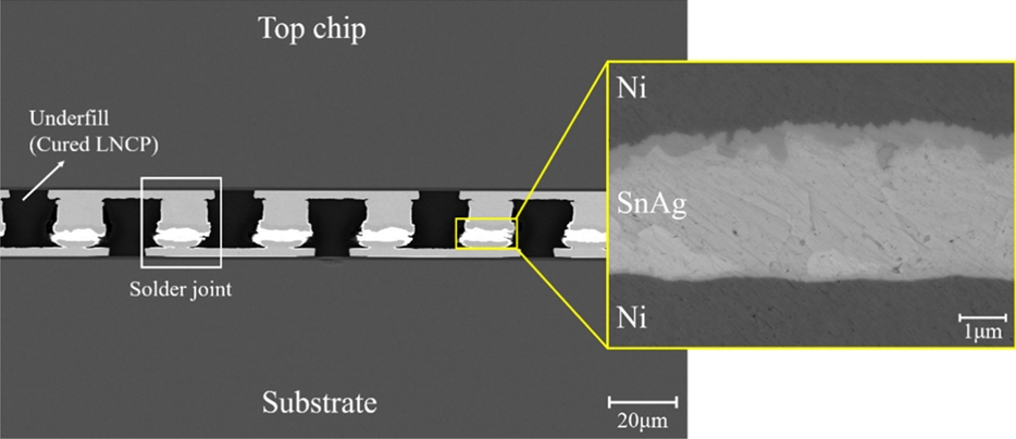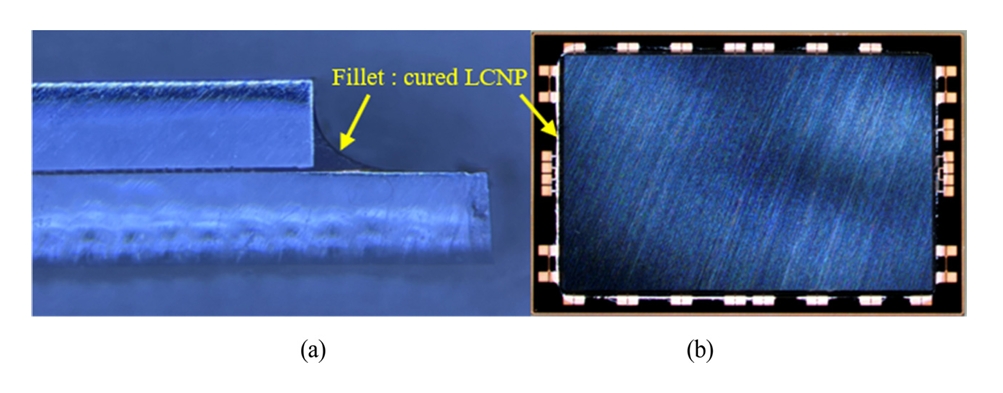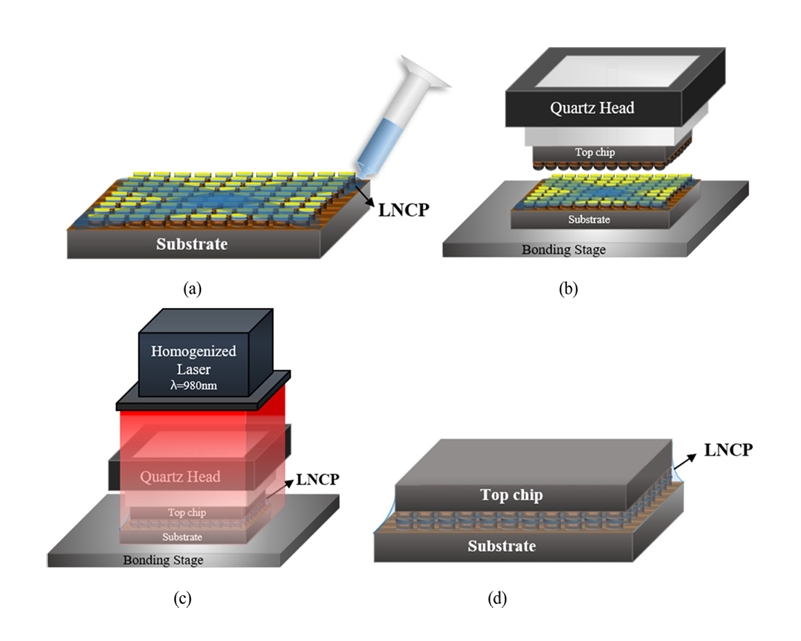 본딩을 수행한다. (d) 본딩이 완료된 샘플에서는 LNCP가 필렛을 형성하며, 언더필 역할을 수행하여 기계적 안정성을 제공한다. 마지막으로, 샘플을