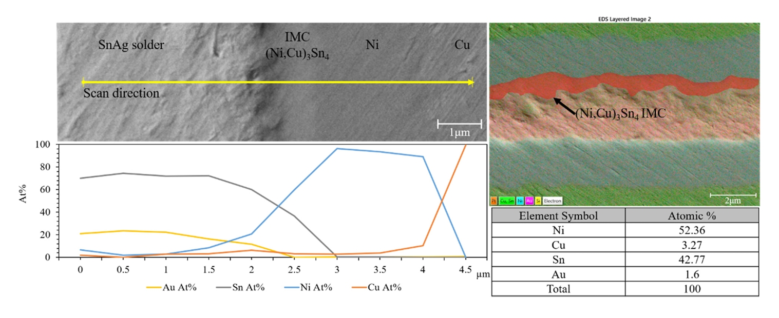 이러한 원소 분포를 기준으로, 주된 IMC는 (Ni,Cu)3Sn4로 예상되며, 일부 (Cu,Ni)6Sn5가 존재할 가능성이 있다. 높은 Ni 함량은 Ni-Sn 기반 IMC가 우세하게 형성되었음을 시사하며, Cu의 포함은 (Ni,Cu)-Sn 복합 IMC