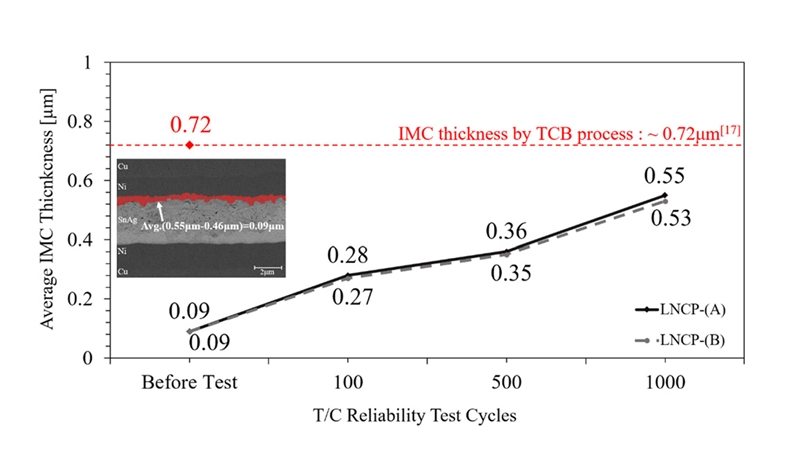 형성된 IMC 두께는 기존의 열 압착 접합(Thermocompression Bonding, TCB) 공정에서 관찰된 두께보다 일관되게 얇게 유지되었다.