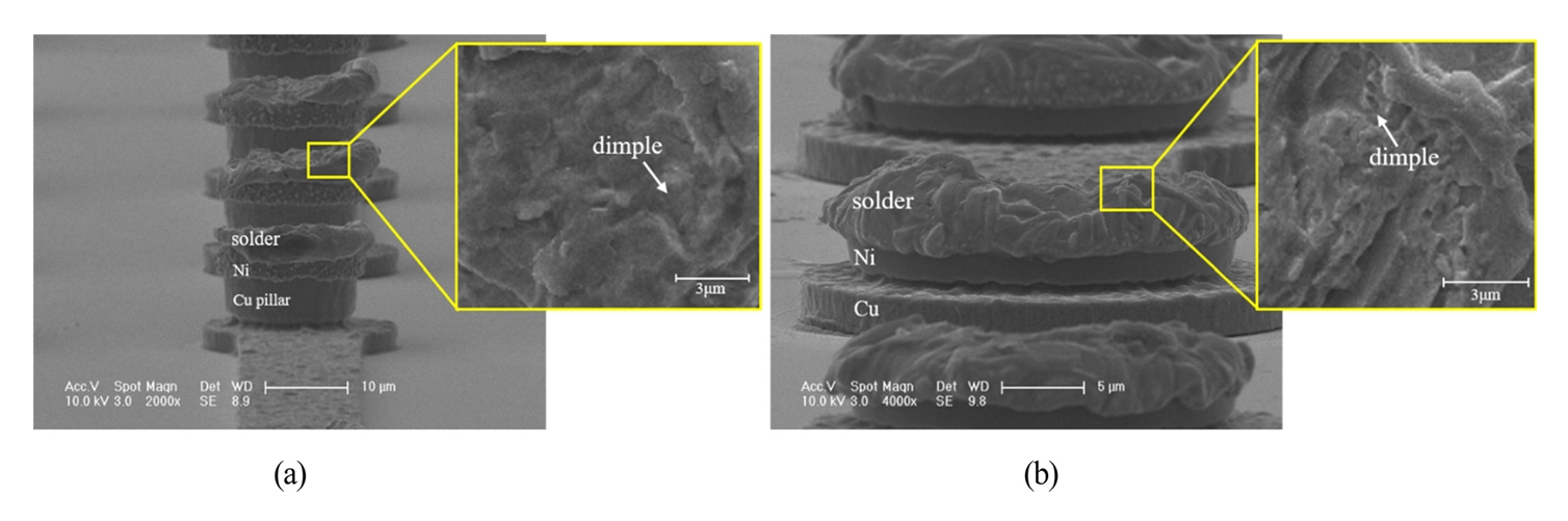 전단시험 이후의 파단 양상을 정밀 분석하기 위해 탑 칩과 기판 측 파단면을 각각 주사전자현미경(SEM)을 이용하여 관찰하였다. 그림 18의 (a)와 (b)는 각각 탑 칩 및 기판 측의 파단면을 경사 관찰 이미지 (tilt view) 와 전단면 확대 이미지를 촬영한 SEM 이미지다. 먼저, 탑 칩 측