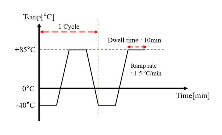 제작된 샘플의 신뢰성을 평가하기 위해 온도 사이클(Temperature Cycling, TC) 시험을 수행하였다. TC 시험은 JEDEC 레벨 N