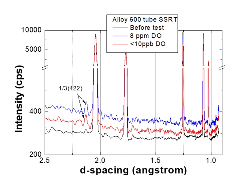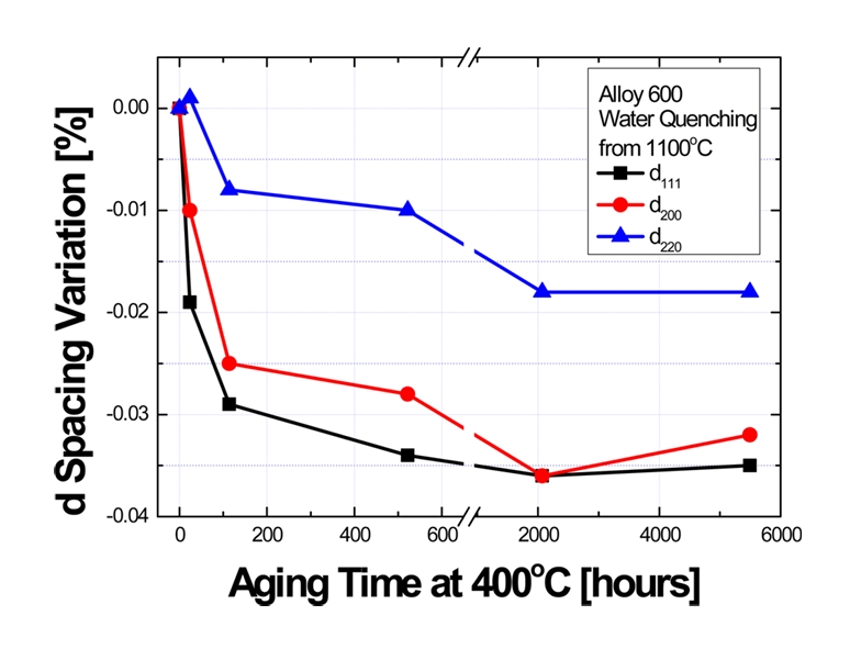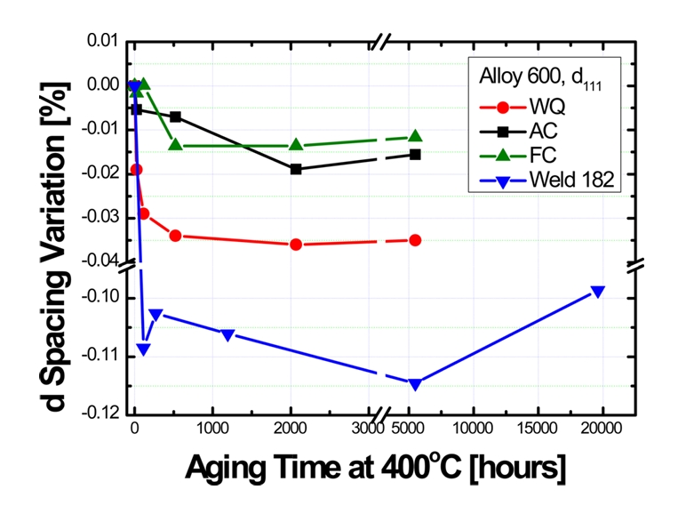 WQ Alloy 600은 400°C에서의 규칙 반응으로 (111) 면을 0.035% 정도 수축시킨다(그림 7). 이 격자 수축은 100 μm 크기의 결정에서 [111] 방향으로 입계를 35 nm 정도 수축시켜 Alloy 600의 입계를 벌리기에 충분하다.