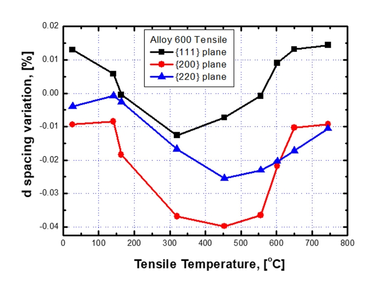 그림 11은 MA Alloy 600을 상온부터 740°C까지 10-4/s로 인장한 시편을 HRPD로 분석하여 (111), (200), (220) 격자의 변화율을 비교한 것이다[13]. 상온과 700°C에서 변형하면 (111) 면은 0.014%정도 팽창하지만, 150°C~550°C에서는 격자 수축이 일어난다. (200) 면은