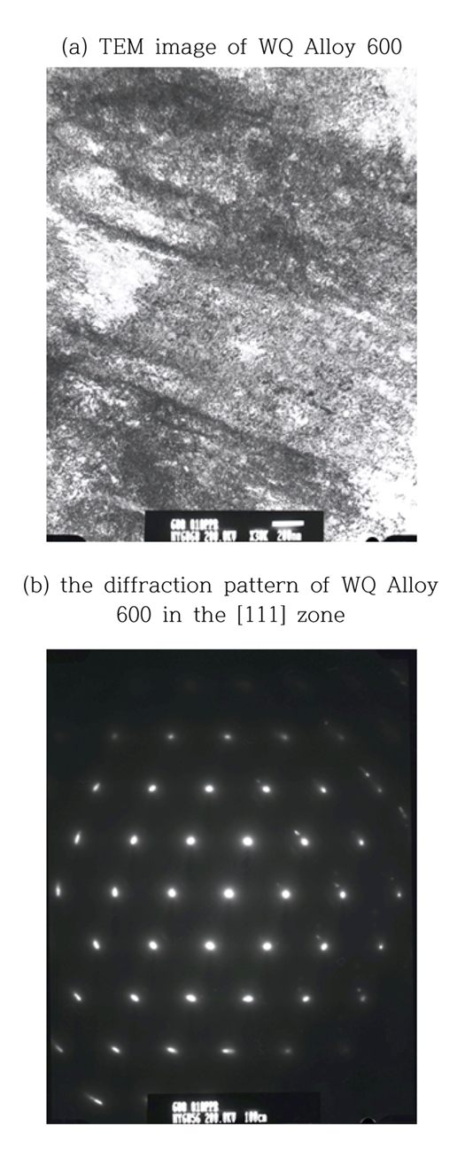 그림 12(a) 및 그림 12(b)는 각각 WQ Alloy 600의 TEM 이미지와 회절 패턴(selected area diffraction pattern, SADP) 결과를 나타낸