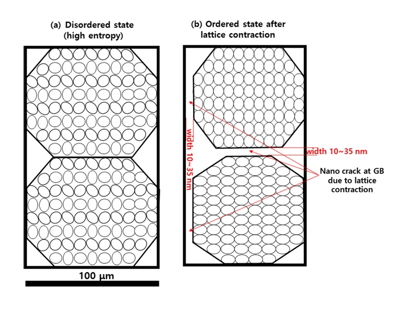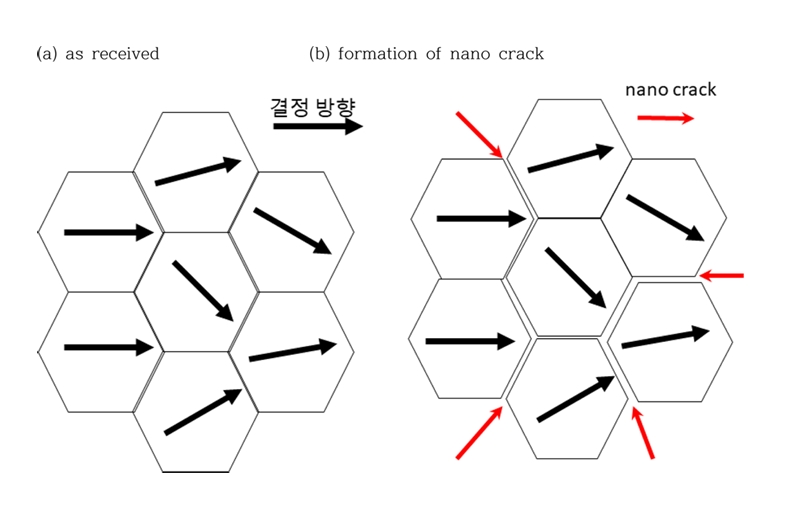 그림 18은 7개의 결정립으로 구성된 재료에서 nano crack이 형성되는 것을 모식적으로 나타낸 것이다. 그림 18(a)에 나타낸 as received 상태는 불규칙 상태이므로 결정 입계가 모두 잘 붙어 있다. 그러나 가동 환경에서 규칙 반응이 일어나면 엔트로피가 감소하고