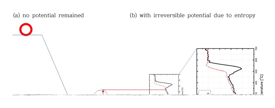 남는 경우를 도식적으로 비교한 것이다. 이 도표에서 Y 축은 온도 또는 잠재력의 크기를 의미하고, X 축은 시간이라고 할 수 있다. 그림 19(a)에서 빨간색으로 표시된 고온의 물체가 평형 상태로 상온까지 냉각되면 검은 선의 물체처럼 바닥에 놓인다. 이 경우는 재료 내부에 잔류 엔트로피나 어떤