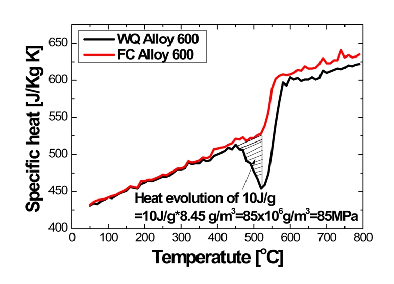 Alloy 600에서 일어나는 규칙 반응은 DSC 방법으로 확인되었다[5,6]. 그림 6은 0.009%의 탄소를 함유한 Alloy 600을 1,095°C에서 30분 유지한 후 WQ 및 FC 처리 시편의 비열을 분석한 결과이다.
