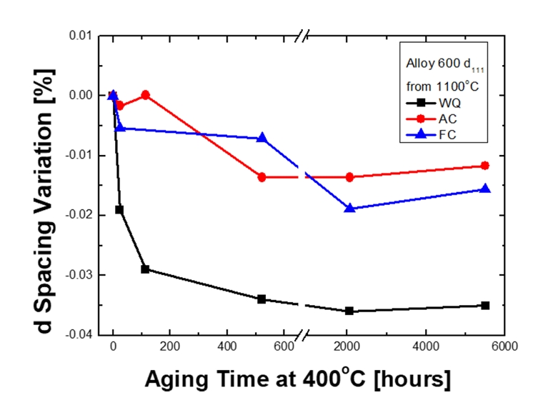 600의 냉각 속도는 격자 팽창에 영향을 미친다[12]. 따라서 WQ Alloy 600은 평균 격자 거리가 팽창되어 있다는 것을 알 수 있다.