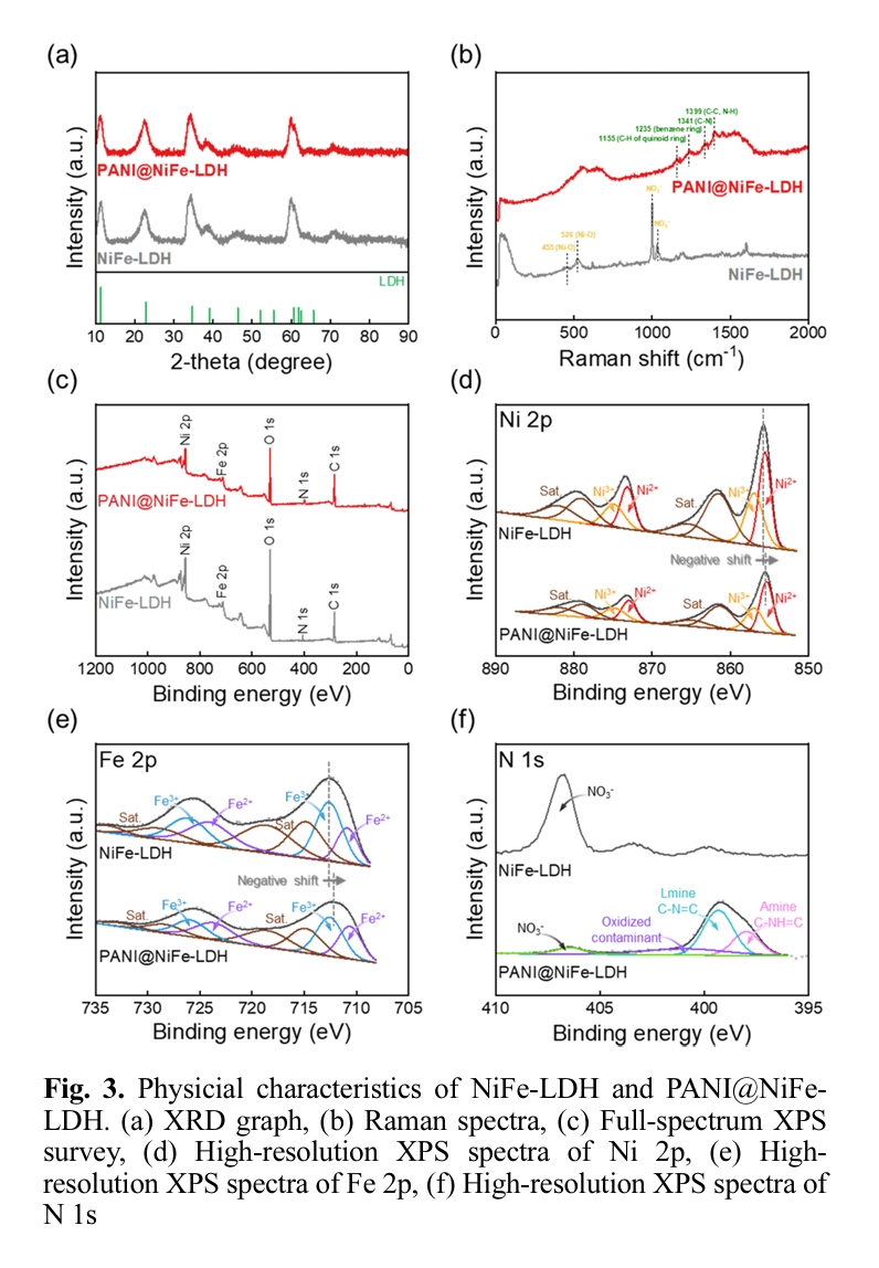 NiFe-LDH와 PANI@NiFe-LDH 모두에서 Ni, Fe, O, C, N 원소가 존재함을 확인하였다(그림 3(c)). NiFe-LDH의 Ni 2p의 경우, Ni2+(855.4 eV), Ni3+(857 eV) 및 위성 피크로 명확히 분리되었다. PANI 성장 이후, 결합 에너지가 낮은 방향으로 이동하였고, Ni3+/Ni2+의 비율이 0.73에서 0.68으로 감소하였다. (그림 3(d)). NiFe-LDH의 Fe 2p의 경우, Fe2+(710.7 eV)와 Fe3+(712.6 eV)로 확인되었고, PANI의 성장 이후, Fe3+/Fe2+ 비율이 감소(2.1 → 1.4)와 함께 결합 에너지의 이동이 관찰되었다(그림 3(e)). 이러한 결과는 PANI가 NiFe-LDH 표면에 성장하면서 두 물질 간 상호작용에 의해 PANI로부터 NiFe-LDH로 전자가 이동하였음을 의미하며,