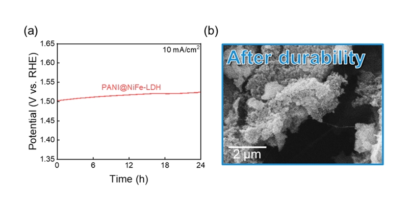 추가적으로, PANI@NiFe-LDH의 안정성을 확인하기 위해 내구성 평가 후 SEM 분석을 수행하였다(그림 5(b)). 분석 결과, 내구성 시험 이후에도 PANI@NiFe-LDH의 표면은 여전히 거칠게 유지되고 있는 것이 관찰되었으며, 이는 장시간의 산소 발생