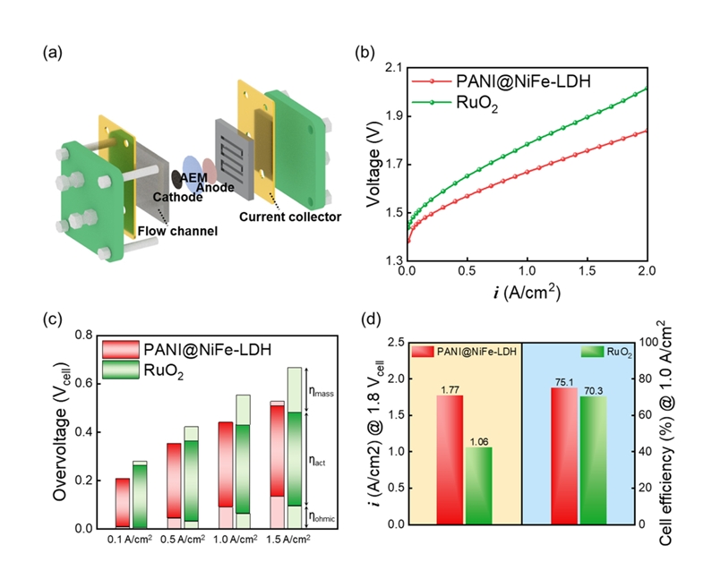 물질 전달 손실을 효과적으로 감소시켰고, 결과적으로 1.8 Vcell에서 1.77 A/cm2의 높은 전류 밀도를 달성하였다. 이는 귀금속 RuO2 산소 발생 촉매가 적용된 음이온 교환막 수전해 셀보다도 높은 성능으로, 비귀금속 기반인 PANI@NiFe-LDH가 고가의 귀금속 촉매를 효과적으로