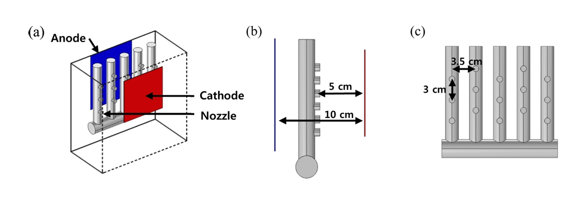비아 내부로 전달하여 가속제[19,20], 억제제[21,22], 평활제[23,24]의 조화로운 작용이 이루어지게 하는 데 목적이 있다[25]. 하지만 실제 공정에서는 노즐 분사에 따른 위치별 유속 분포 차이로 인해 전극 표면에 이온 농도 분포가 불균일하게 형성될 수 있으며, 이러한 유동