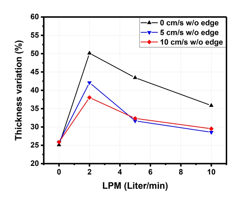 0.74~0.77 % 소폭 상승하는 경향을 보였다. 2 L/min의 노즐 분사만 적용된 조건에서는 가장 높은 두께 편차가 확인되었다. 이는 분사된