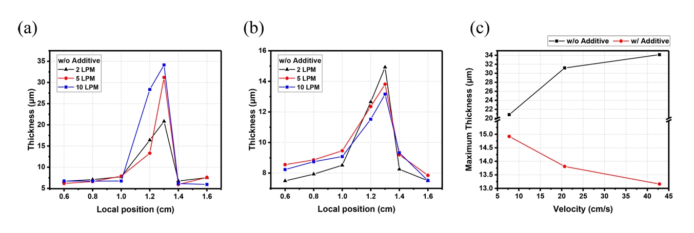 이를 보다 정량적으로 나타낸 그림 5(c)에서는 각 조건에서의 최대 두께 값을 유속에 따라 정리하였다. 첨가제를 사용하지 않은 경우에는 유속 증가에 따라 최대 두께가 지속적으로 상승한 반면,