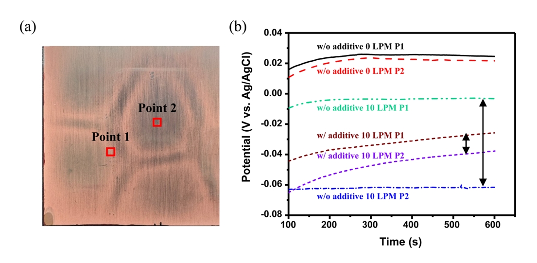 이러한 유동의 불균일성이 실제 전기화학 반응에 어떤 영향을 미치는지 확인하기 위해, 도금 시간을 단축하여 얻은 결과인 그림 6(a)에서 두께 차이가 뚜렷하게 나타난 부위를 선정하여 전극 전위 측정을 수행하였다. 두 지점은 0.2 × 0.2 cm2 크기로 설정되었으며, 동일한 전류밀도 조건(10 mA/cm2)에서 유동과 첨가제 유무에 따른 전극 전위를 측정하였다. 측정 결과인 그림 10(b)에서 첨가제를 사용하지 않고 유동이 없는 조건(0 L/min)에서는 두 측정 지점(Point 1과 Point 2)에서 전위차이가 600초 기준 0.00295