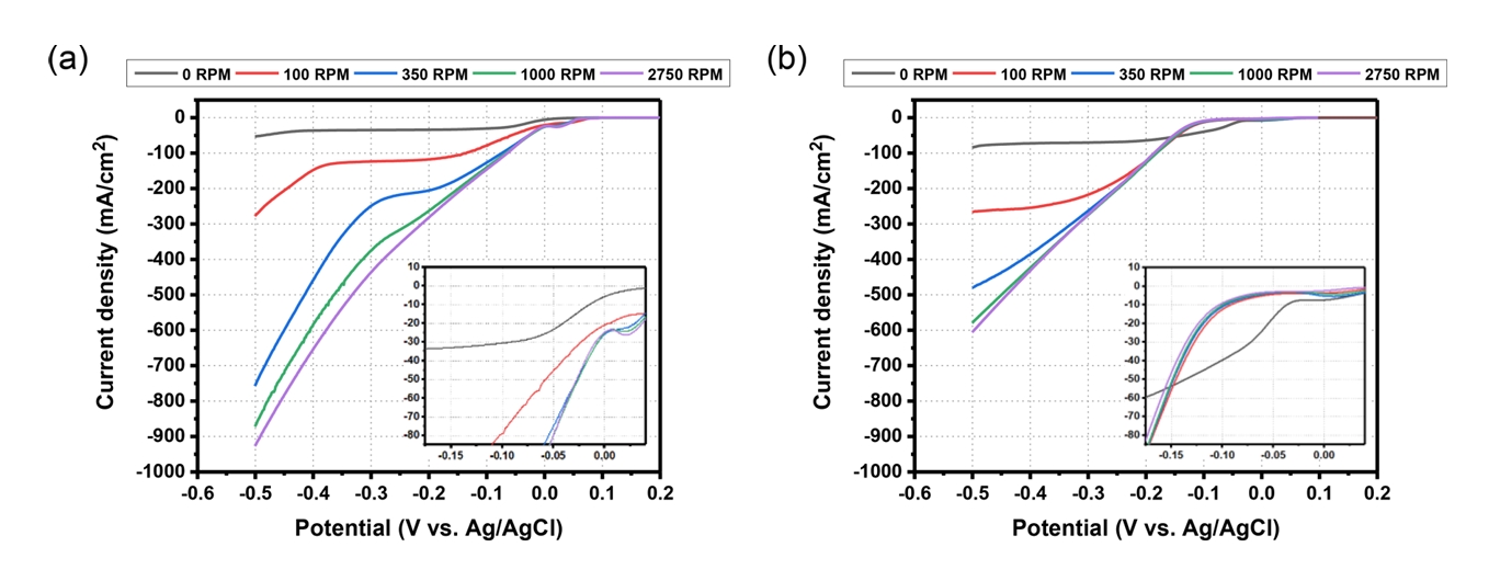 반면, 첨가제를 포함한 조건 그림 7(b)에서는 일정 전위 구간에서 전류 밀도의 증가가 억제되는 특성이 나타났으며, 이러한 반응 억제 현상은 0 RPM 조건에서는 관찰되지 않고 100 RPM