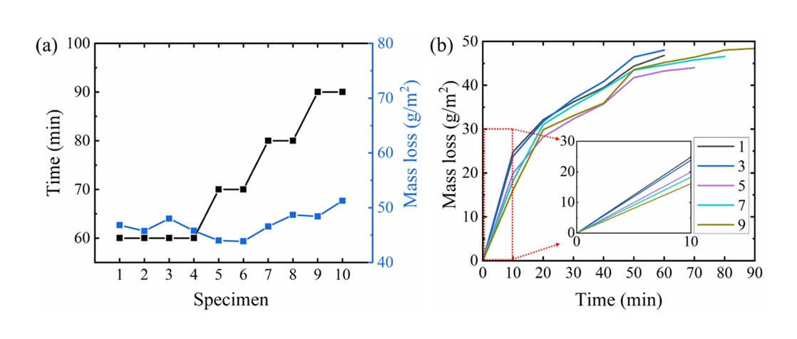 그림 13a는 시편 개수에 따른 산세 시간 및 최종 질량 감소를 나타낸다. 1–4번 시편은 산세 완료에 60분이 소요되었으며, 이후 5–6, 7–8, 9–10번