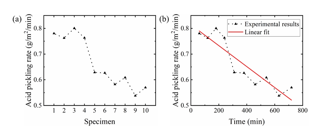 여기서 r은 산세 속도(g/m2/min), t는 시간(min)이다. 본 모델을 활용하여 산 용액의 사용 시간에 따른 산세 효율을 예측할 수 있으며, 이를 기반으로 실제 공정에서 산 용액의 교체
