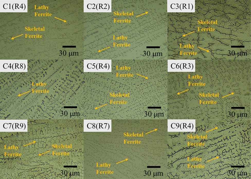 높은 입열량을 나타내는 조건 2, 3, 6에서는 조대한 δ-페라이트(2차 수지상간격 : 평균 6.9–9.7 μm)가 확인된다. 반대로, 낮은 입열량을