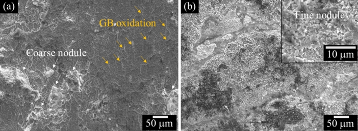관찰된다 (그림 7a). 또한, 결정립 내 대비 선택적으로 산화된 결정립계도 드러난다. 반면, 용접부는 전반적으로 거칠고 불균일한 산화층이 형성되었으며, 미세한 산화물