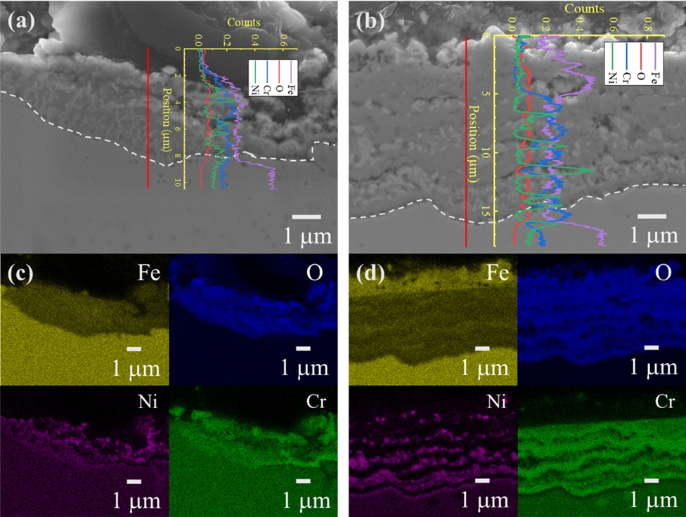 그림 8의 EDS 선, 면 조성 분석 결과를 보면, 산화층은 크게 (Fe, Cr)3O4 스피넬층과 Ni-Fe 금속층이 혼합된 구조로 구분된다. (Fe, Cr)3O4 스피넬이 산화 중 모재 내부로 성장함에 따라 상대적으로 낮은 산소 친화도를 가지는 Ni이 방출되기 때문에[50], Ni-Fe 금속이 (Fe, Cr)3O4 스피넬에 둘러 싸인다. 또한, 열역학 계산에 따르면 (Fe, Cr)3O4 스피넬을 형성하는 산소 분압은 Ni-Fe 금속을 산화시키기에 낮은 수준이다[51].