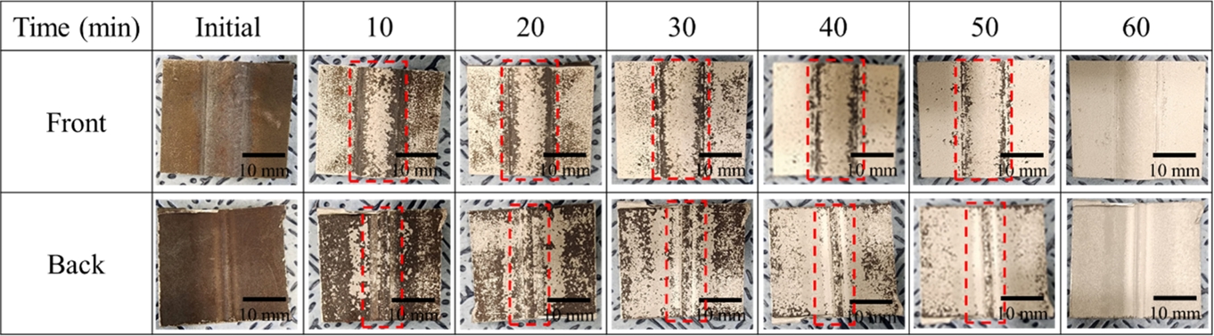 첫 20분간 산세 중 벗겨지기 시작한다. 앞, 뒷면의 모재 산화층은 쉽게 제거되지만, 용접부(그림 9의 빨간색 사각형)는 상대적으로 느리게 제거된다. 이는 그림 8b에서 나타나듯이 모재보다 용접부 표면에 더 두껍게 형성된 산화층에 기인한다. 30–40분간 추가적인 산세를 진행함에 따라 모재의 산화층은 대부분 제거된다.