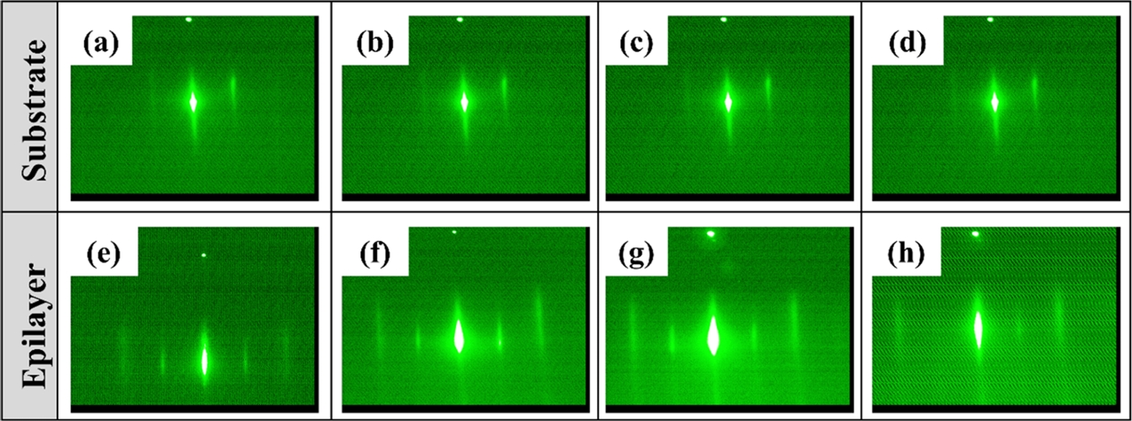 shown in Figure 2(e-h). These RHEED patterns from the grown Ga2O3 films also showed sharp streaky features with more clear additional reflections.
