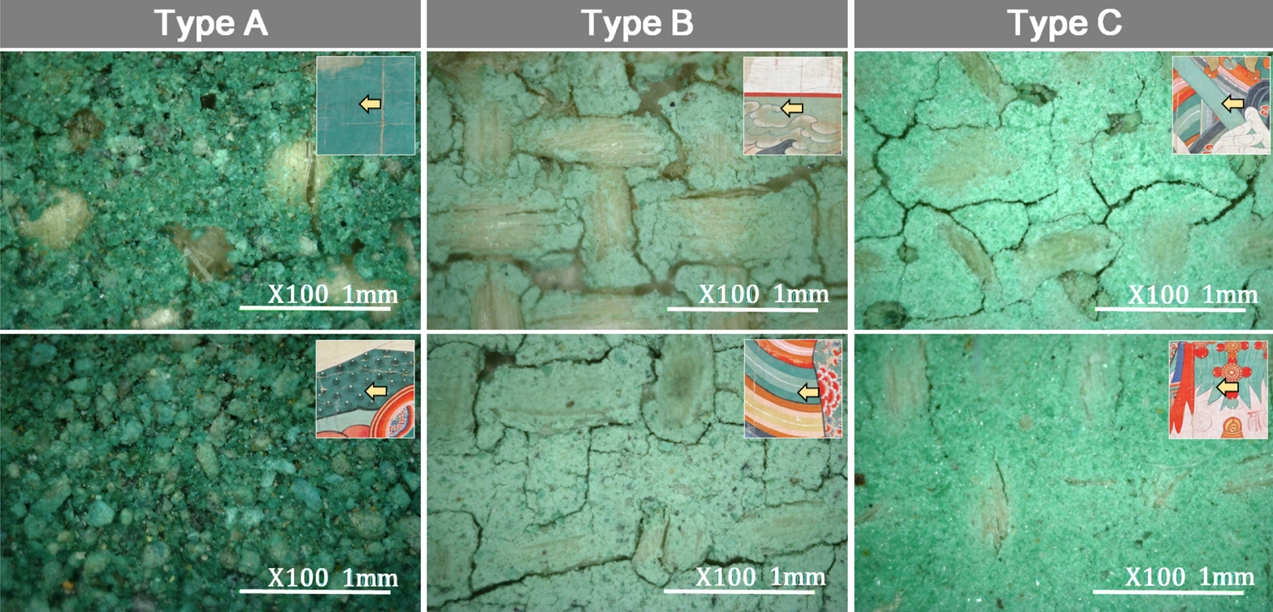 유형은 Cu, Cl과 함께 Pb가 검출되며, 백록색과 같이 비교적 연한 녹색을 나타낸다. 특히 Pb의 검출 함량이 A와 C 유형에 비해 높았으며 현미경