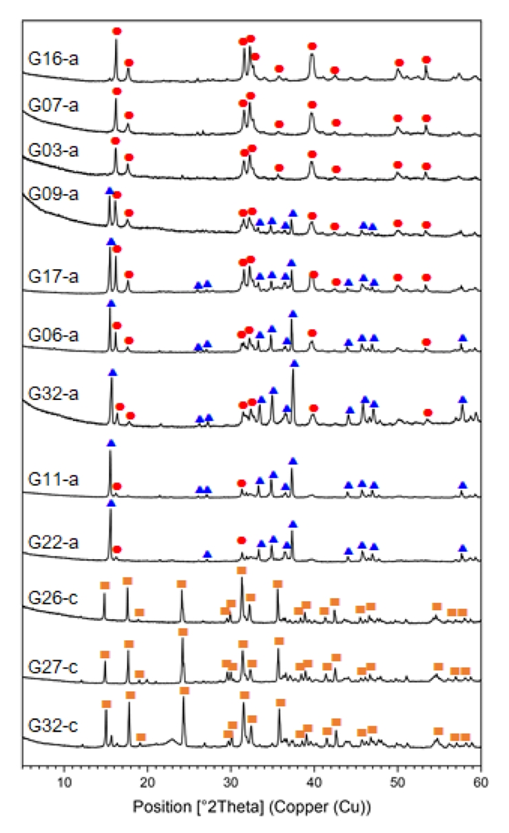 검출된 C 유형에서 수습한 안료를 ‘c’로 분류하여 광물 결정분석을 실시하였다(표 3). a 그룹 안료의 주요 광물상으로는 botallackite와 atacamite 가 동정되었다. 일부 시료에서는 atacamite 단독의 회절 패턴이
