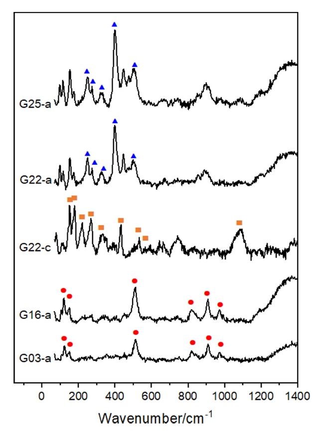 해석된다. 또한 라만 분석 결과, 119, 149, 511, 822, 911, 977cm-1에서 atacamite의 피크가, 251, 279, 324, 401, 503cm-1에서 botallackite, 155, 178, 217, 268, 354, 433, 538, 599, 1085cm-1 부근에서 malachite의 특성 피크들이 확인되었다(그림 6)[24-27].