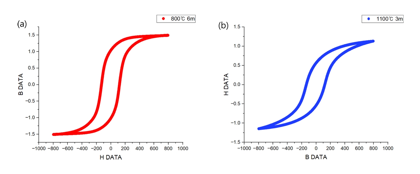 ๊ทธ๋ฆผ 10์ ์์๋ฐ๋ B8 ๊ธฐ์ค์ผ๋ก ๊ฐ์ฅ ์ฐ์ํ ๊ฐ์ ๋ํ๋ธ ์กฐ๊ฑด์ธ 800ยฐC 6๋ถ, 1.501T์, ๊ฐ์ฅ ๋ฎ์ ๊ฐ์ ๋ณด์ธ 1100ยฐC 3๋ถ, 1.139T