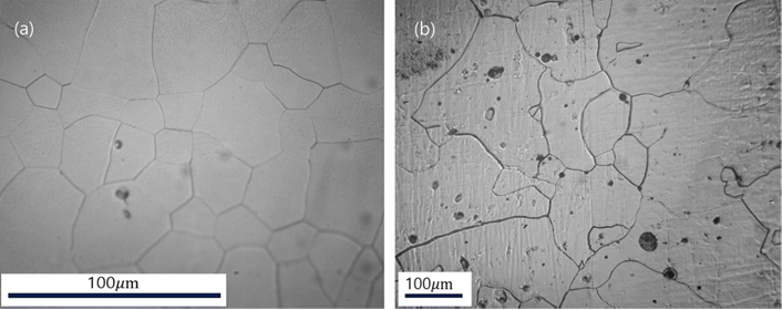 ์ฌ์ง์ ๋ํ๋ธ ๊ฒ์ด๋ค. 800ยฐC์์๋ ํ๊ท ๊ฒฐ์ ๋ฆฝ ํฌ๊ธฐ๊ฐ ์ฝ 30 ฮผm ์์ค์ด์์ผ๋, 1100ยฐC์์๋ ์ฝ 200 ฮผm๋ก ๊ฒฐ์ ๋ฆฝ ํฌ๊ธฐ๊ฐ ๊ธ๊ฒฉํ ์ฆ๊ฐํ๋