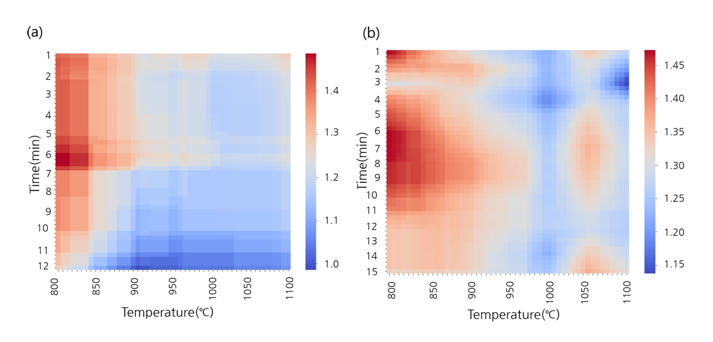1000ยฐC, 1050ยฐC, 1100ยฐC์ ๊ฒฝ์ฐ์๋ ๋์ผ ๋ฐฉ์์ผ๋ก ์๋ก์ด ์๊ฐ ์กฐ๊ฑด์ด ์ถ๊ฐ๋์๋ค(900ยฐC์ 2๋ถ, 1000ยฐC์ 5๋ถ, 1050ยฐC์