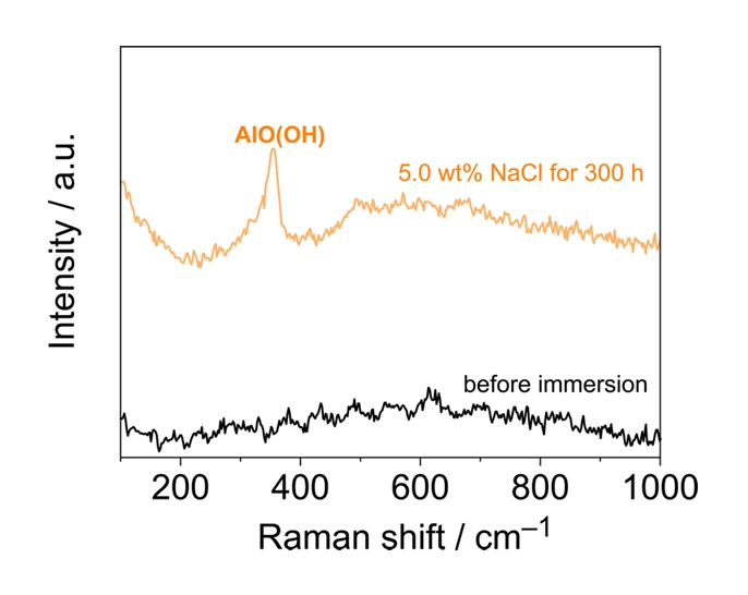 ๊ทธ๋ฆผ 10์ 50o C์์ 5.0 wt% NaCl ์ฉ์ก์ ์นจ์งํ๊ธฐ ์ ๊ณผ 300 ์๊ฐ ์นจ์ง ํ ํ, UNS A93003 ์ํธ ํ๋ฉด์์ ์ธก์ ํ ๋ผ๋ง ์คํํธ๋ผ(Raman
