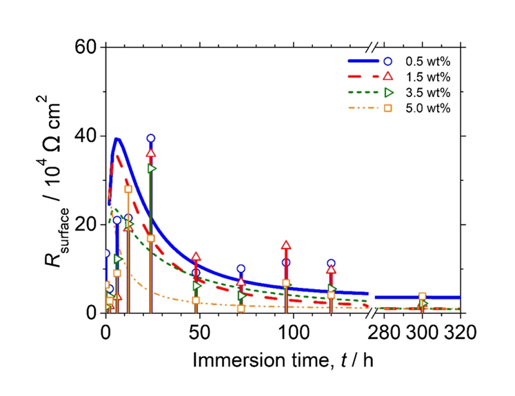 ๊ฐ๊ฐ์ NaCl ๋๋(0.5, 1.5, 3.5, 5.0 wt%)์์ ์นจ์ง ๋ ์ ๊ทน์ ๋ํด, ์นจ์ง ํ 2, 12, 24, 48, 120, 300 ์๊ฐ