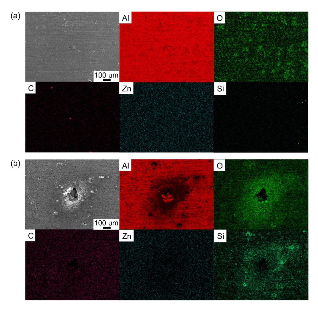 ๋ํด ๋ ๋์ Volta potential ๊ฐ์ ๊ฐ์ง๋ฉฐ, ๋ณด๋ค ์๊ทน์ ์ธ (cathodic) ํน์ฑ์ ๋ณด์ธ๋ค๊ณ ๋ณด๊ณ ํ์๋ค[16]. ์ด๋ ๊ตญ๋ถ์ ์ผ๋ก ๋ฏธ์ธ ๊ฐ๋ฐ๋ ์ ์๋ฅผ ํ์ฑํ์ฌ ํด๋น ๊ธ์๊ฐ ํํฉ๋ฌผ ์ฃผ๋ณ์์ ๊ตญ๋ถ ๋ถ์์ ์ ๋ฐํ๋ ์์ธ์ด ๋ ์ ์๋ค. ๋ฐ๋ผ์ ๊ทธ๋ฆผ 5์์ ๊ด์ฐฐ๋ ๋ฐ์ ๊ฐ์ด, AlโMnโFeโSi ๊ณ์ด ๊ธ์๊ฐ ํํฉ๋ฌผ ๋ถ๊ทผ์์ ๊ตญ๋ถ ๋ถ์์ด ์ฐ์ ์ ์ผ๋ก ๋ฐ์ํ ํ์์ ํด๋น ์