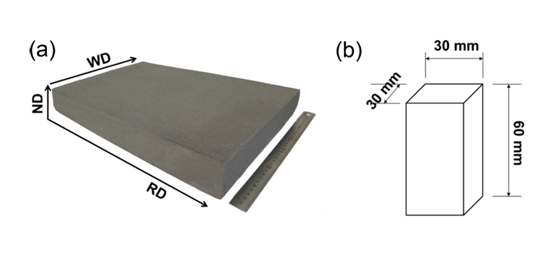 of 30 mm (WD) × 30 mm (RD) × 60 mm (ND) (Fig 1(b)) were prepared and tested at 923 K and 1073 K. Creep tests were conducted under constant