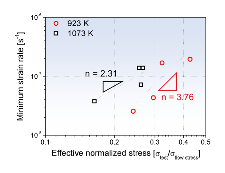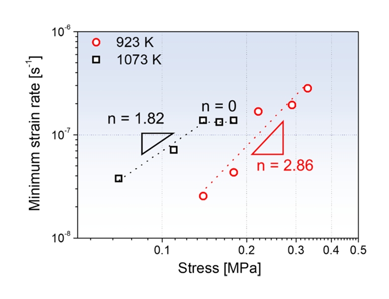 The stress exponent at 923 K, initially measured as 2.86, increased to 3.76 after