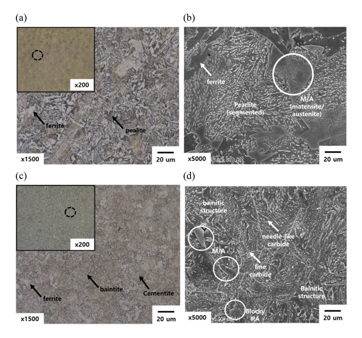 아래 그림 1은 OM 및 FE-SEM을 이용해 SCM 435와 개발강종의 초기 미세조직을 관찰한 결과이다. 먼저 OM을 통해 관찰한 결과 그림 1(a)의 SCM 435에선 페라이트기지(matrix) 위에 대다수 분절된 펄라이트 조직을 관찰할 수 있다. 반면에 그림 1(c)의 개발강종에서는 전체적으로 하부 베이나이트 조직이며, 베이나이트 조직 내부에 침상형 페라이트가 고립된 형태로 형성된 것을 관찰할 수 있다[19-22]. 개발강종에서 저온변태조직 특성이 나타난 이유는 SCM 435에 비해 Mo 중량이 2배 이상 많아 강력하게 탄화물을 생성할 수 있으며 이는 페라이트와