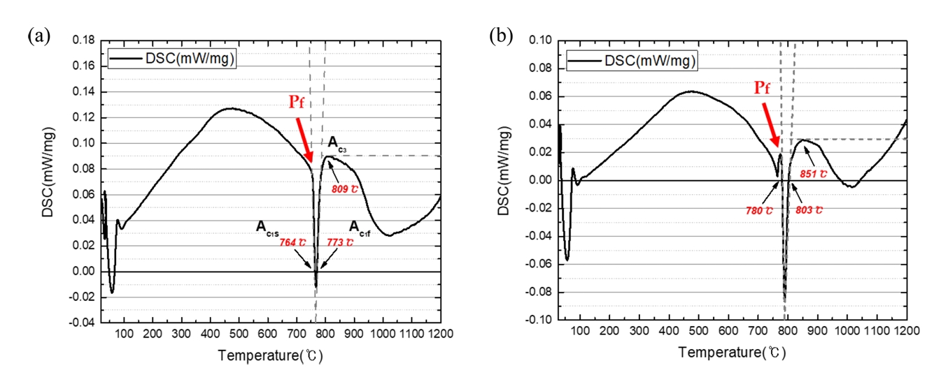 DSC결과를 아래 그림 2와 같이 나타내었다. Ac1과 Ac3 변태온도는 endo peak와 exo peak를 그리는 곡선에 접선을 그어 기지선과 만나는 부분을 각 변태 온도로 설정하였다[29,30]. SCM 435의 Ac1과 Ac3 변태온도는 각각 754°C와 809°C이고, 개발강종의 Ac1과 Ac3 변태온도는 각각 780°C와 851°C이다.