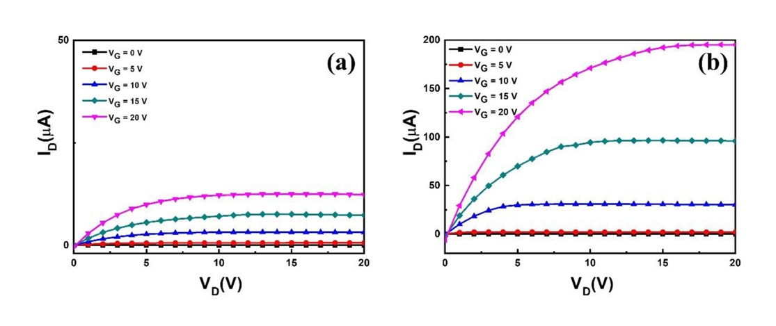 were measured under ambient air conditions by sweeping the drain voltage (VD) from 0 to 20 V in 1 V increments at various constant gate voltages (VG). The TFTs fabricated using both annealing methods exhibited clear pinch-off behavior